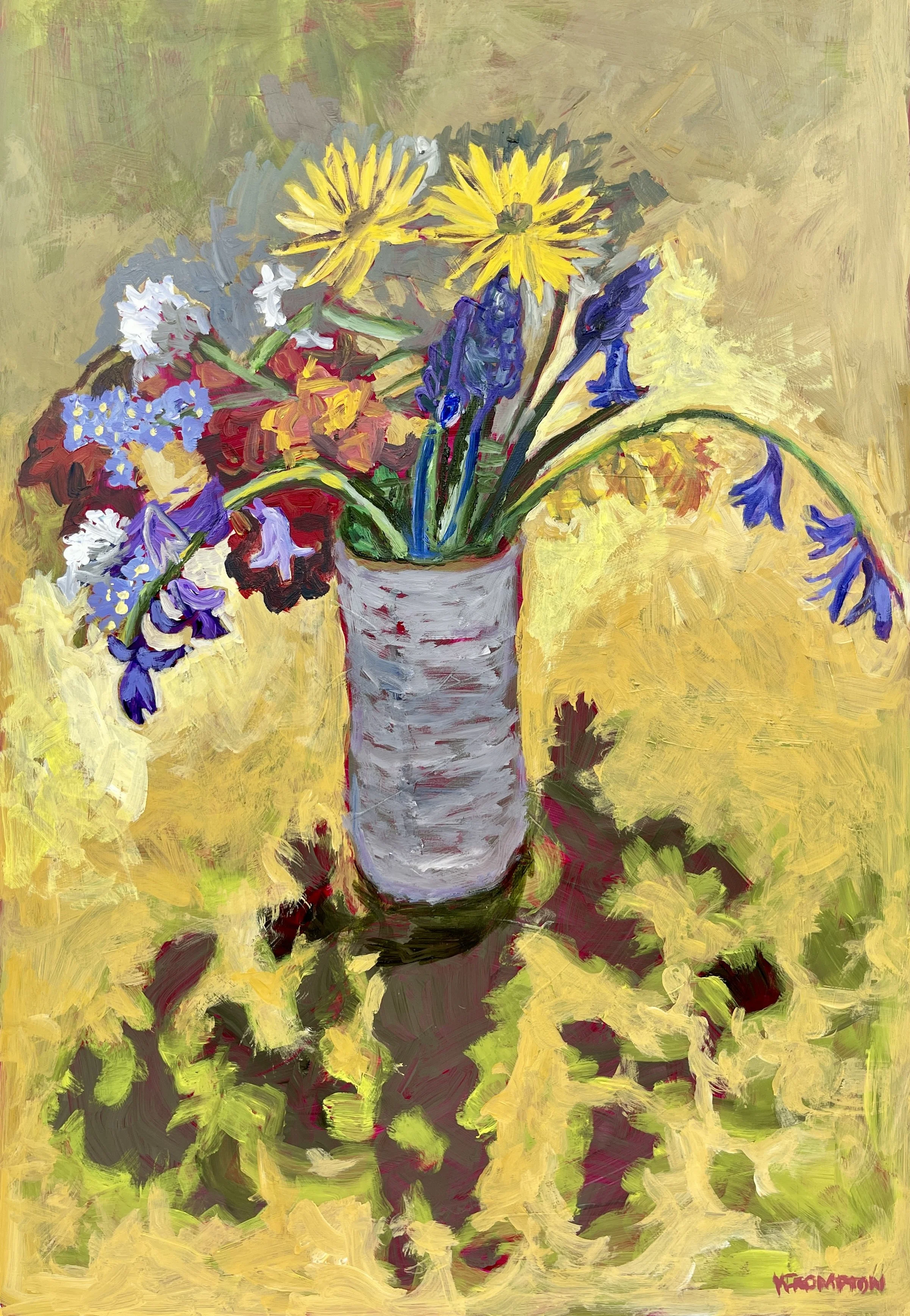 Flowers from our garden, painted from life. The yellow ground feels like sunlight and each flower has its own character, reaching in different directions. The pale grey vase holds it all together without competing.