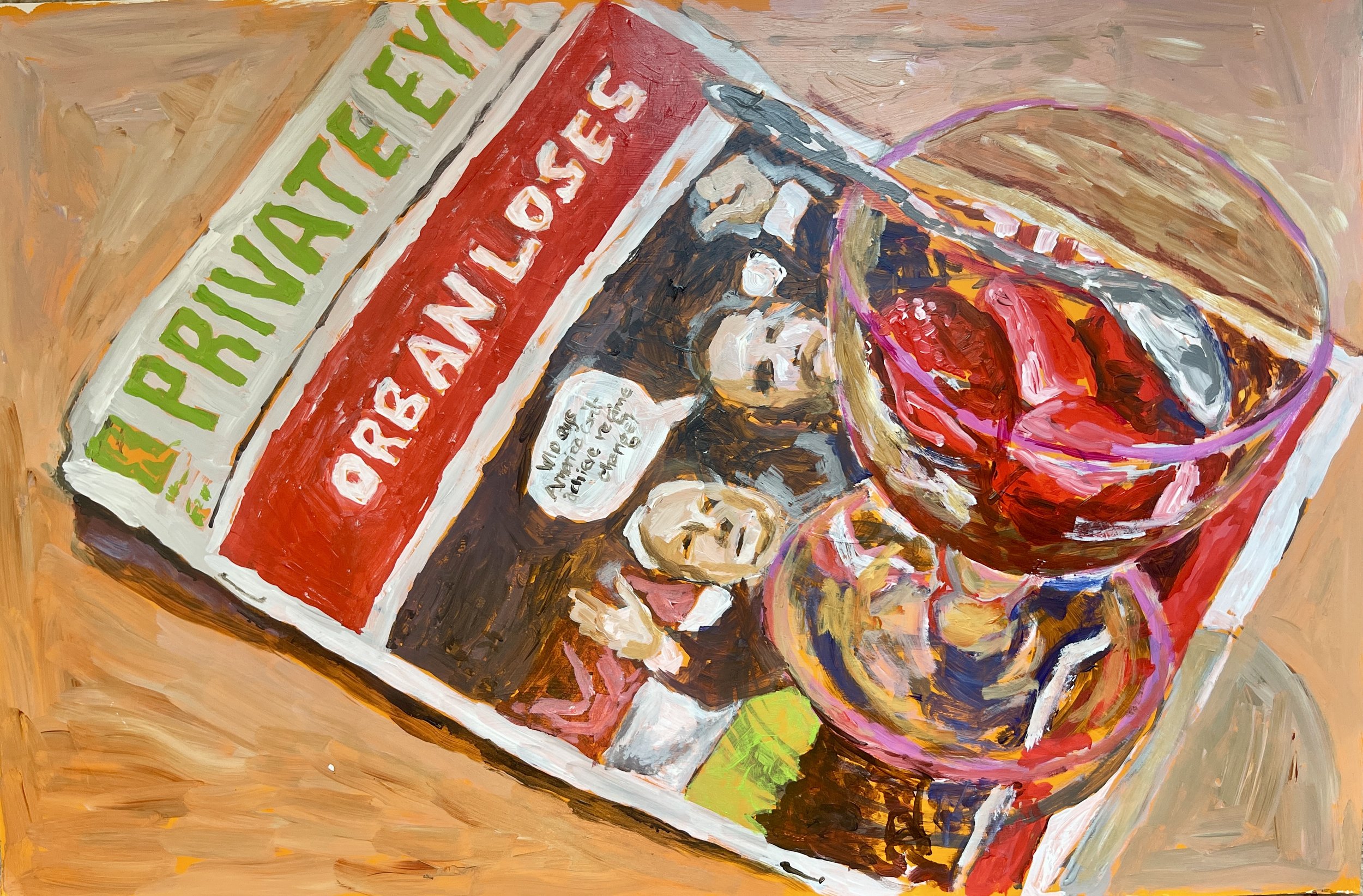 ORBAN LOSES PAINTING, April 2026Painted to mark Orban's defeat in Hungary. The Private Eye cover caught it perfectly, mocking JD Vance and the idea of regime change. The third time I've painted Private Eye covers. The others responded to Trump's re-election and the Greenland crisis. It’s a way to bringing politics into the work. This one, at least, was good news. A bowl of strawberries, a little light in dark times.Acrylic on Stone Paper, 42 × 29 cm