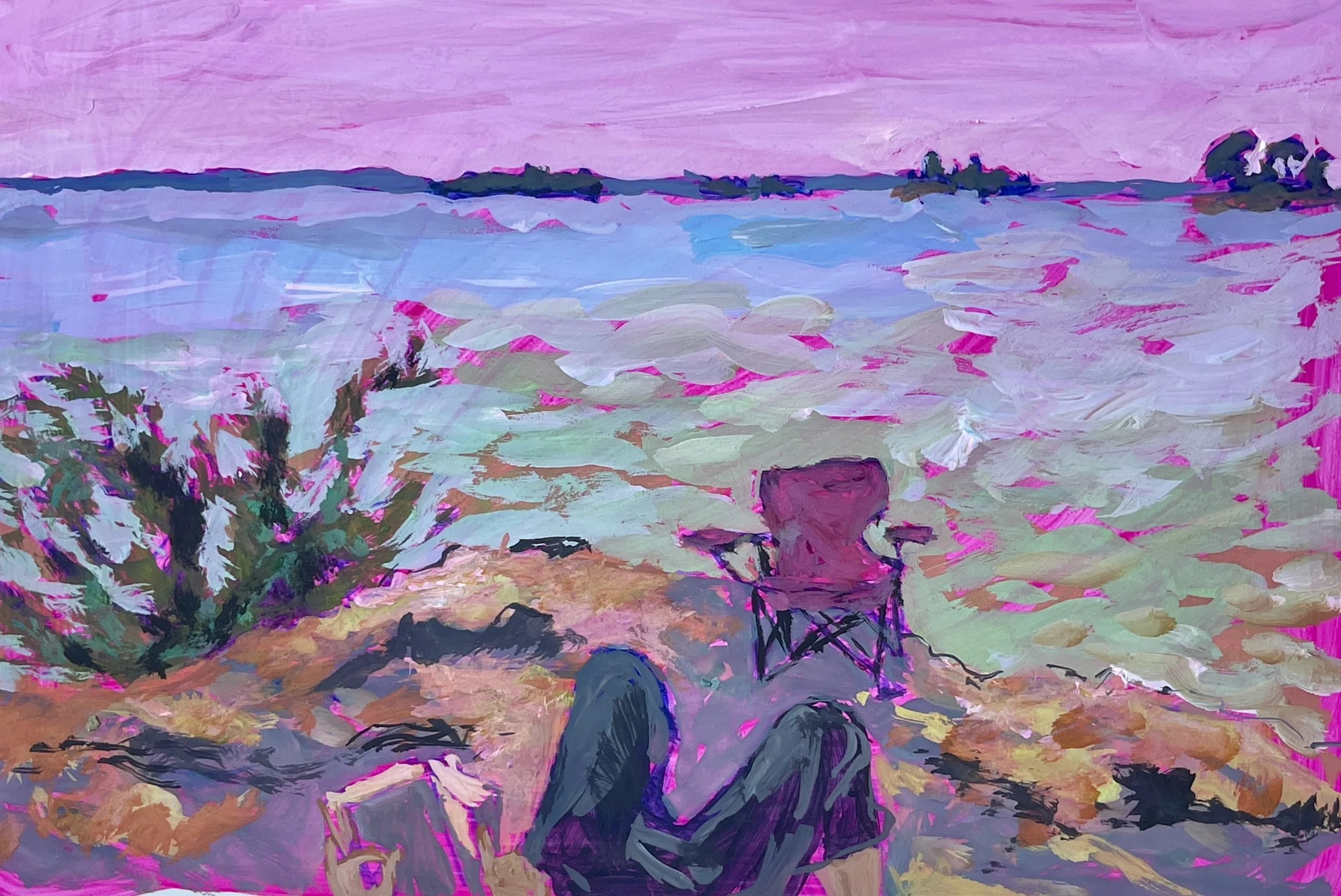 Painted on location on the shores of the St Lawrence River, Canada, and captures a moment of relaxation, a precious gift. While the picnic chair takes centre stage, the subject of the painting lies back, is only visible from their knees, and their hands holding open the pages of her book.