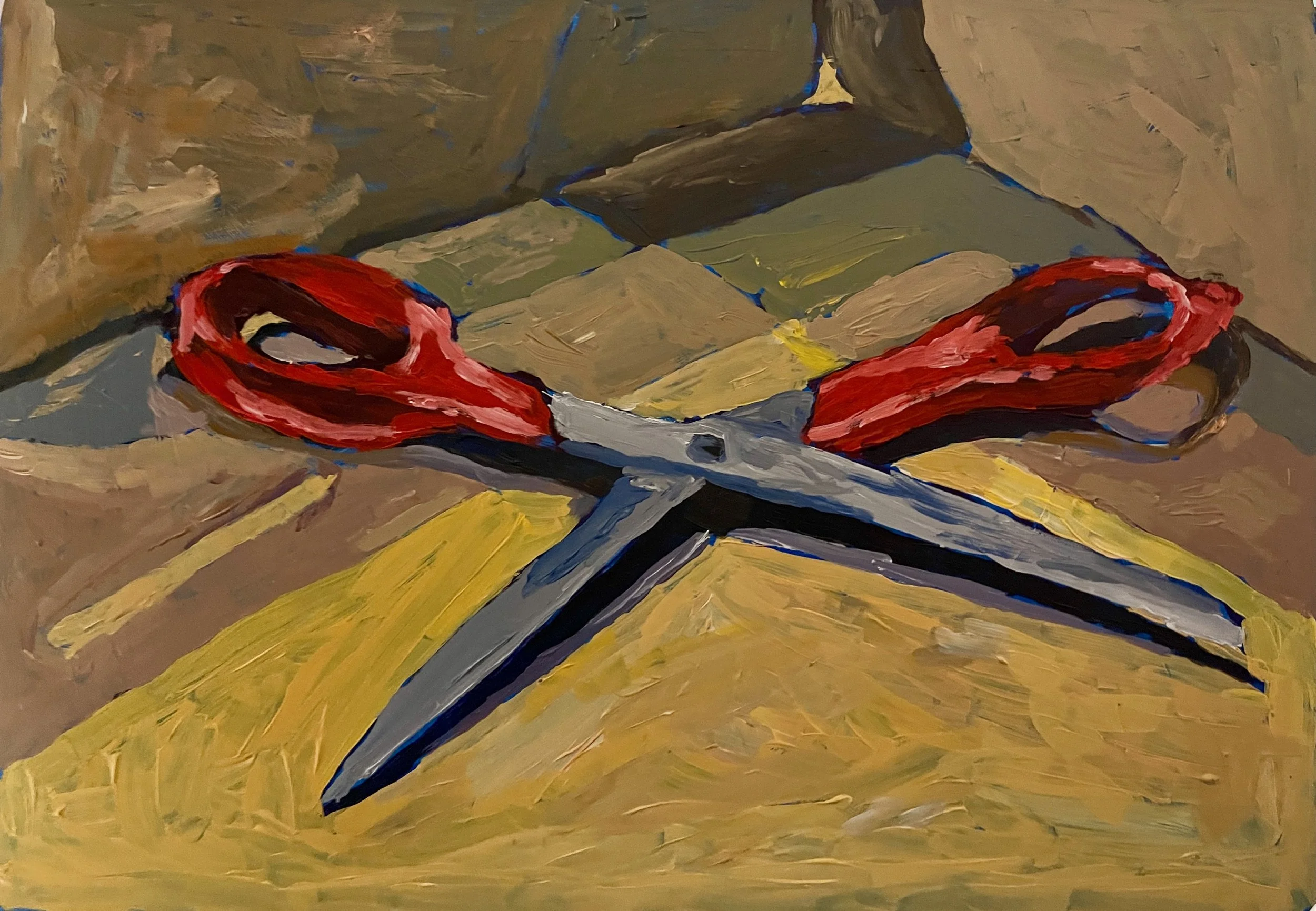 The red handles are vivid against the warm ground, rich and saturated but also completely ordinary. Kitchen scissors, painted this close and this large, open like that, they become something else.