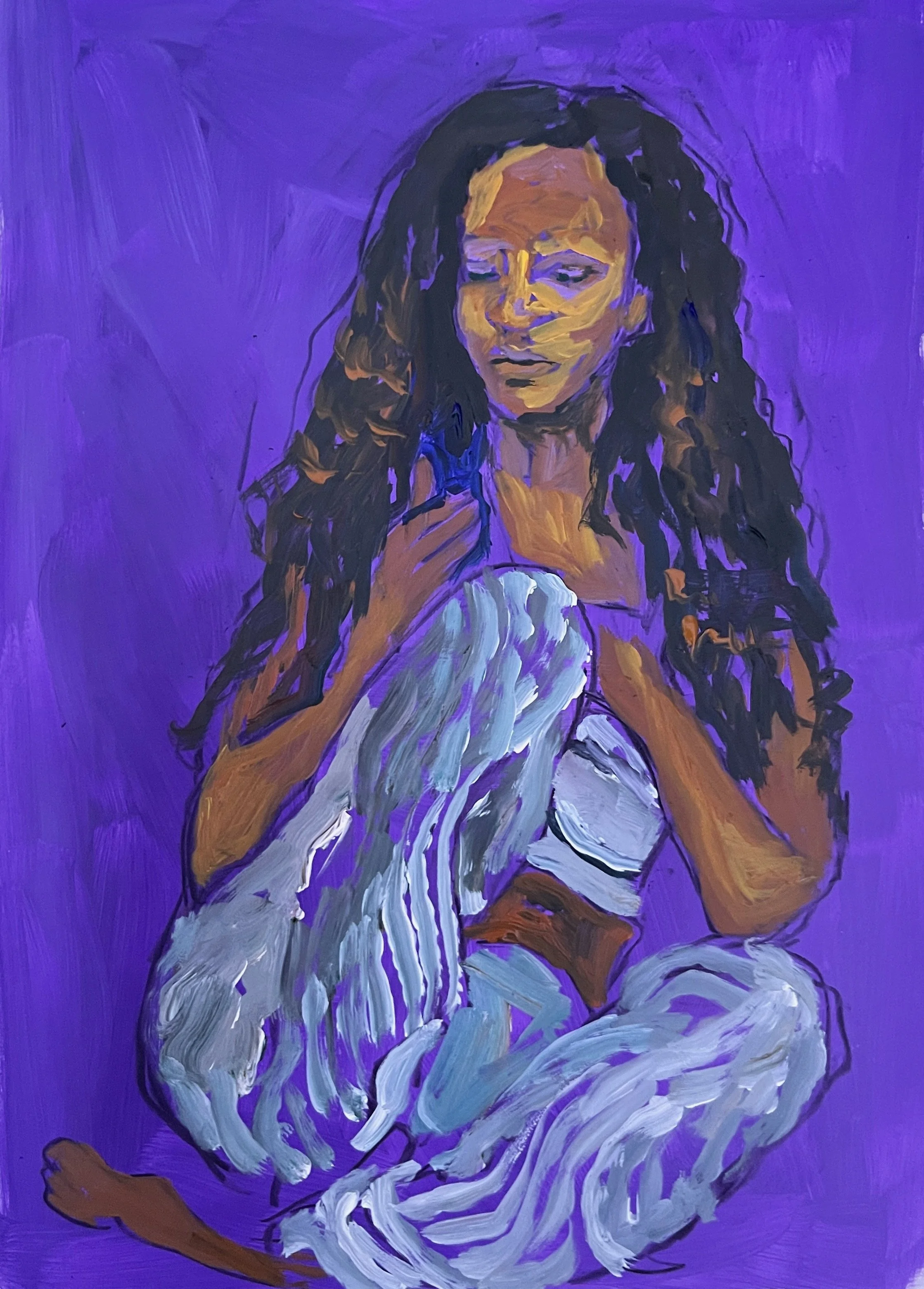My daughter's friend is often at our house and always agrees to be painted - but it's rare there's time to get the paints out. This was a summer dusk, and I asked Rosh what colour she would like to be painted on. The violet she chose makes the painting. It pushes her forward into the light.