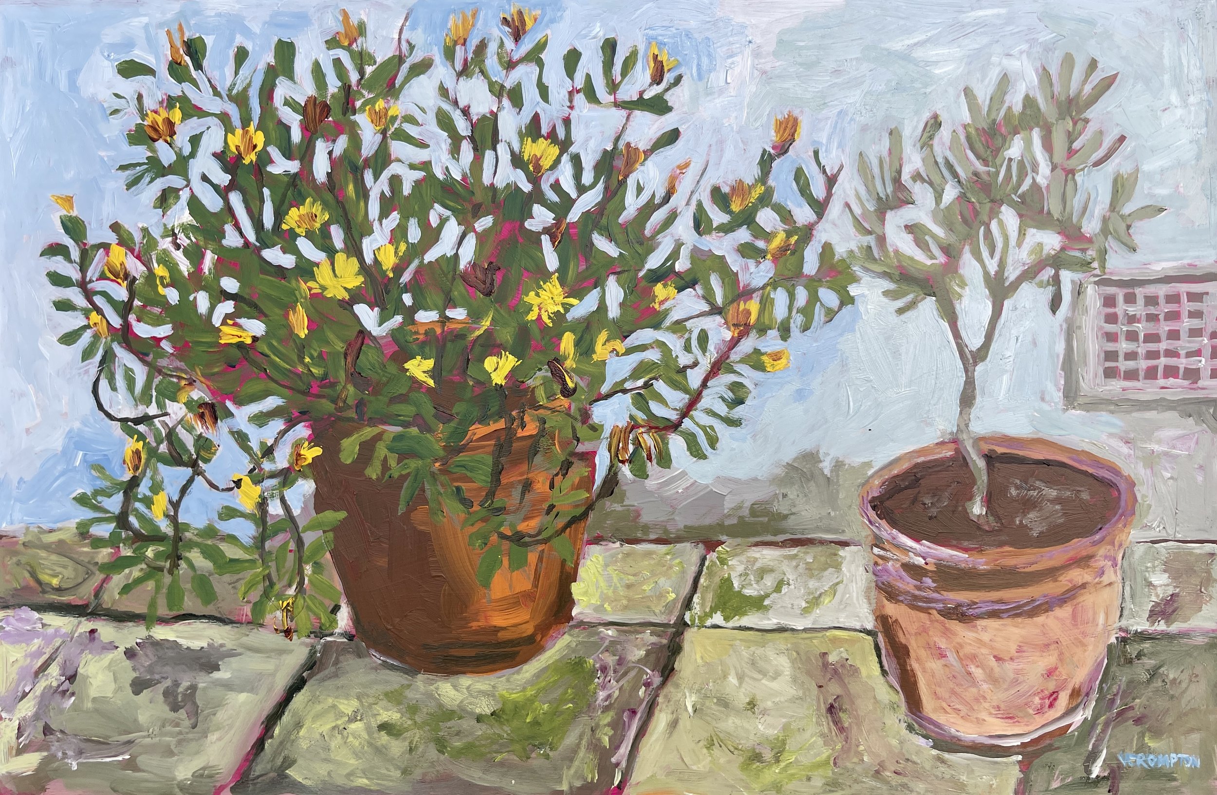 I set myself the challenge of painting these yellow flowers because the stalks and leaves are a complex tangle of growth going in every direction at once. My usual approach is narrative - I follow what I see. Here I had to find a different way in, suggesting the mass and energy of the plant rather than describing it branch by branch. And next to it, the simpler olive tree.